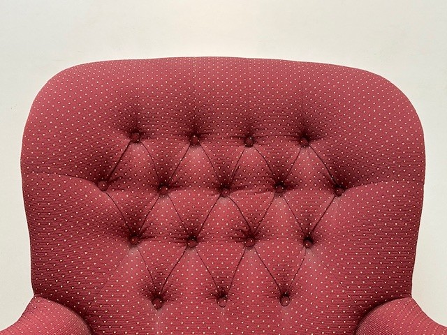 Elegantní zaoblená zádová opěra je zdobena dekorativními knoflíky