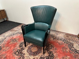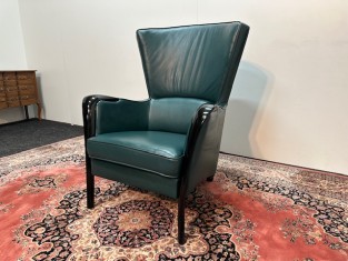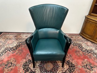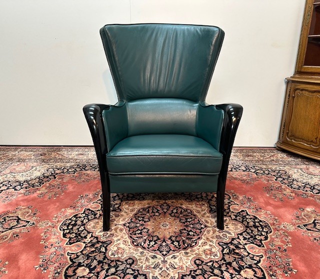 Retro křeslo je čalouněno kůží v odstínu petrolejově zeleném