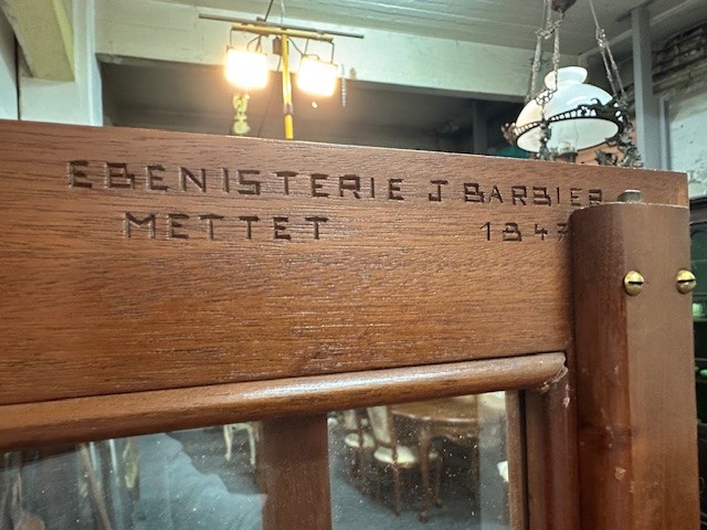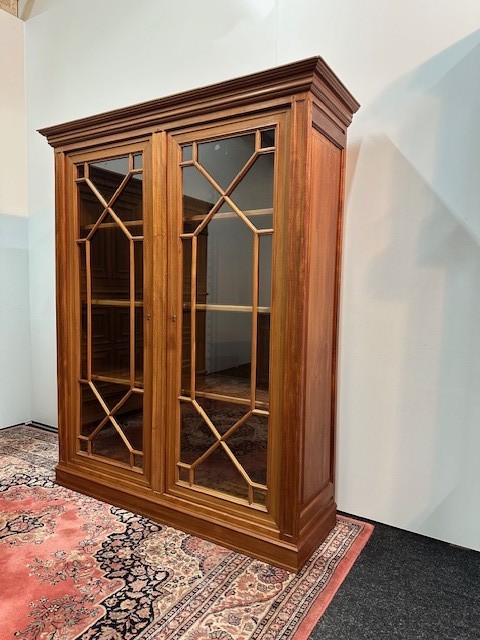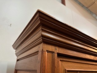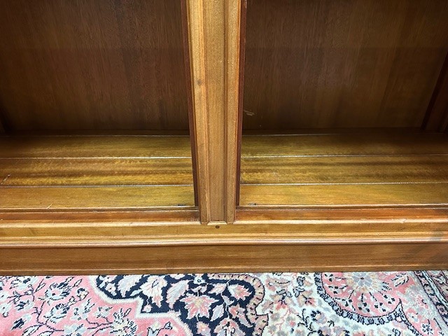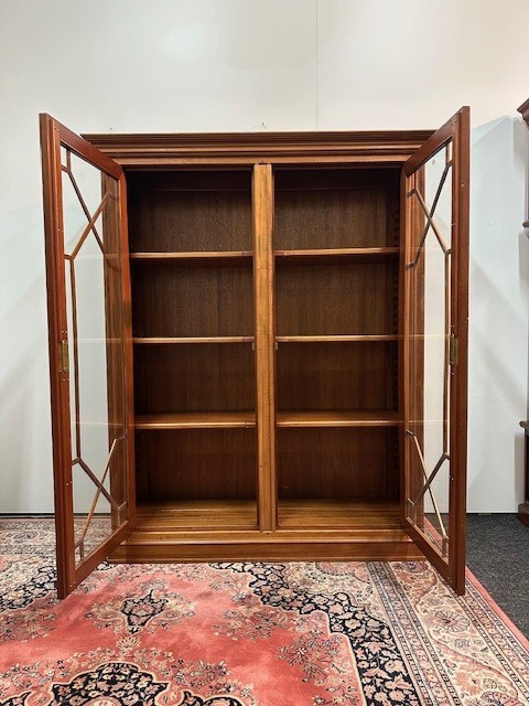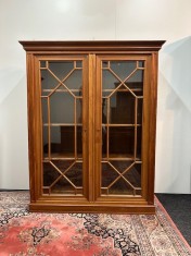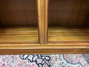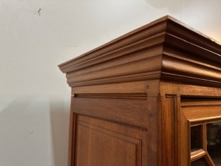 Dvojitá prosklená dvířka po celé výši nábytku s dekorativními dřevěnými lištami