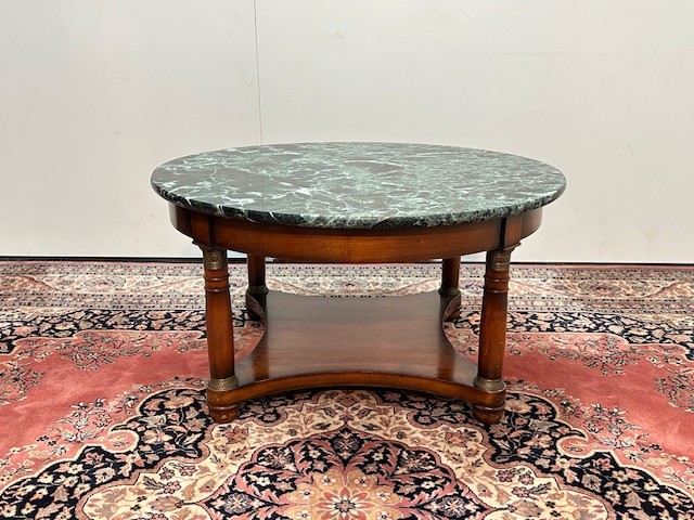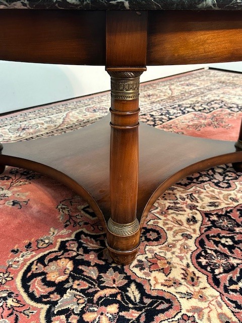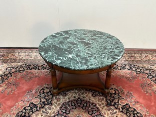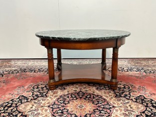 Kulatá mramorový deska spočívá na dřevěné konstrukci se 4 sloupy s mosaznými zdobnými prvky
