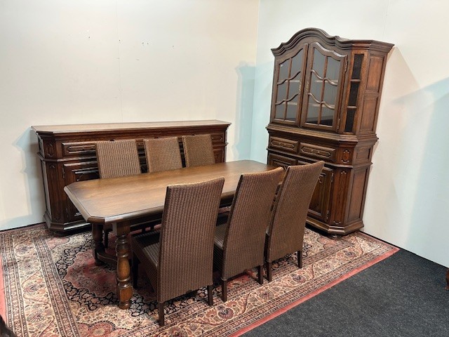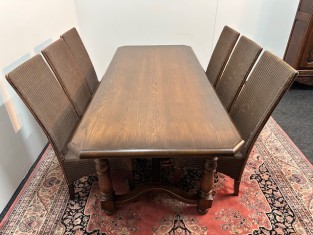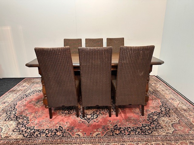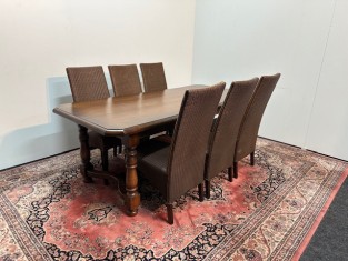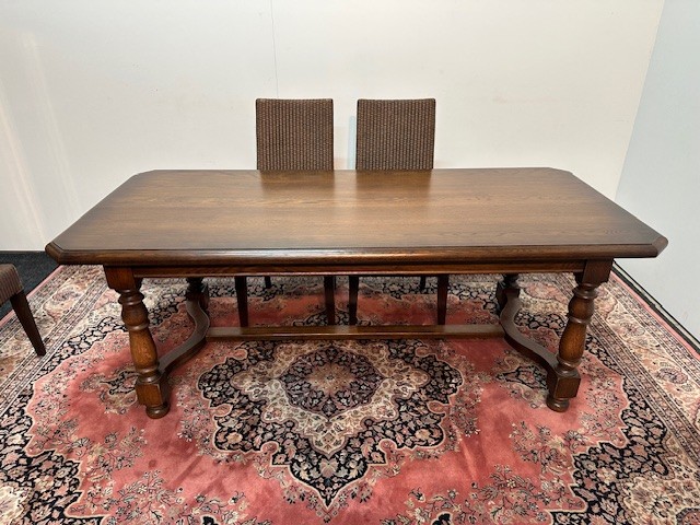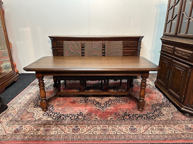 Mohutné soustružené nohy vespod spojeny trnoží zabezpečující stabilitu a pevnost stolu