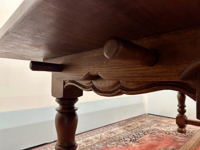 Mohutné soustružené nohy vespod spojeny trnoží, která zabezpečuje perfektní stabilitu a pevnost stolu