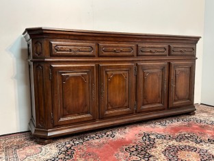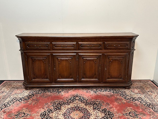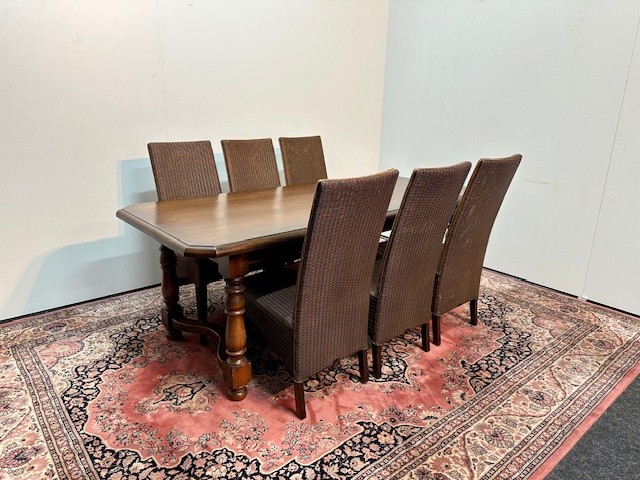 Set je tvořen robustní dlouhou komodou , knihovnou / vitrínou a jídelním stolem se 6 židlemi