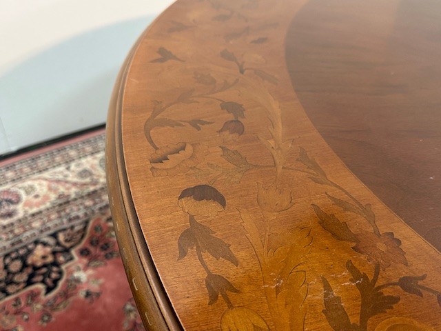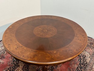 Stůl je kulatého tvaru , deska zdobena intarzií