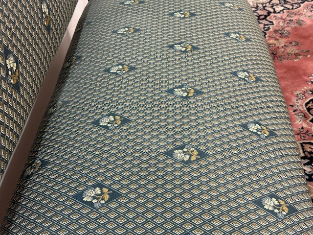 Čalouněno kvalitní textilií v zelenobéžovém tónu, bez poškození