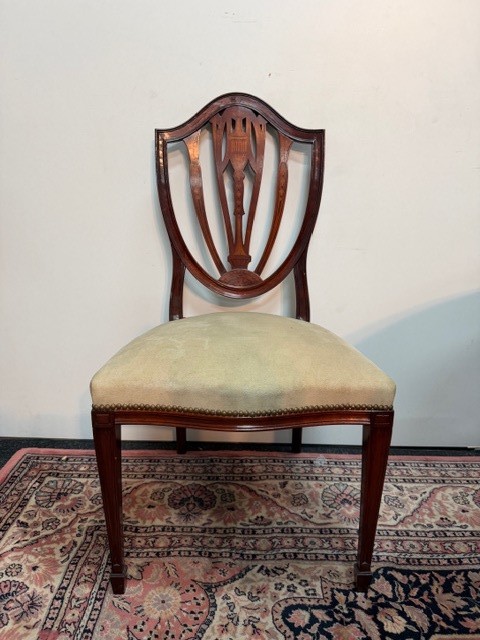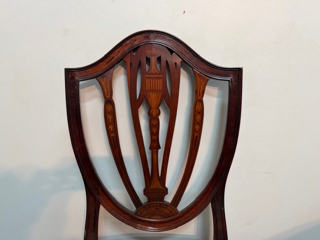 Ke stolu náleží 4 kusy elegantních židlí , které jsou čalouněny, zádová opěra je zdobena intarzií