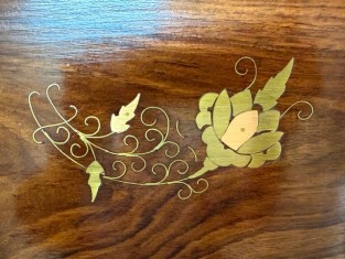 Dřevo upoutá krásnou kresbou a ozdobnou mosaznou intarzií