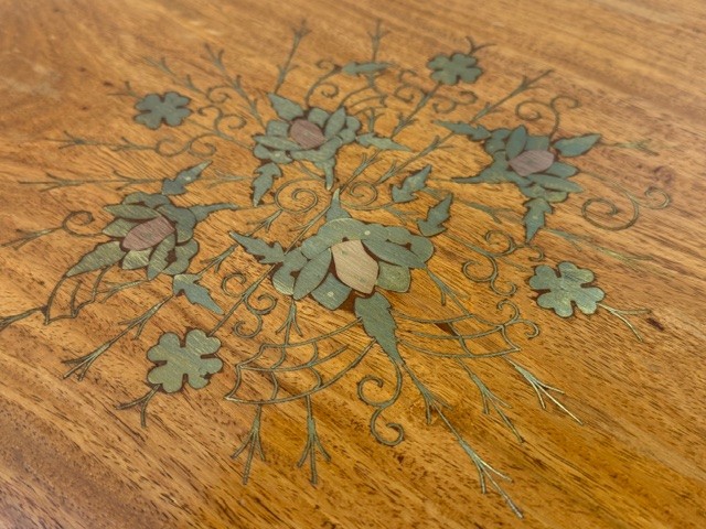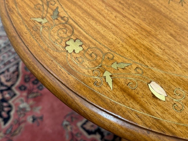 Kulatá deska stolku je po svém obvodu rámována mosaznou intarzií, florální motiv