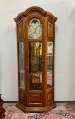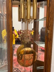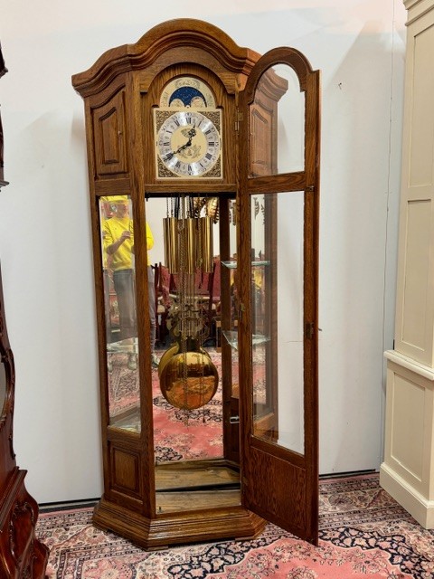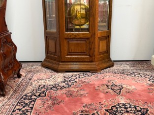 Tento luxusní velký model podlahových hodin je umístěn v prosklené skříni s dubovým rámem