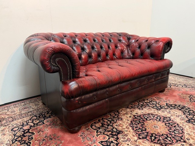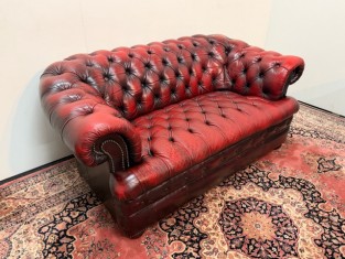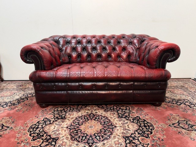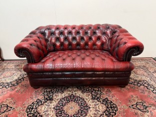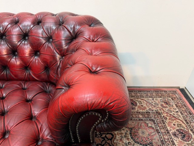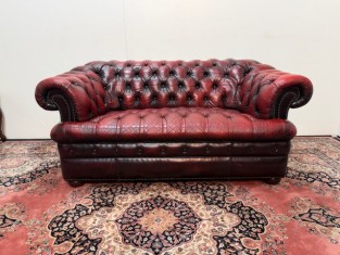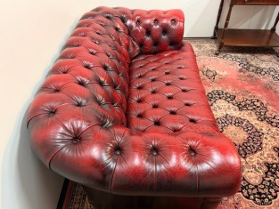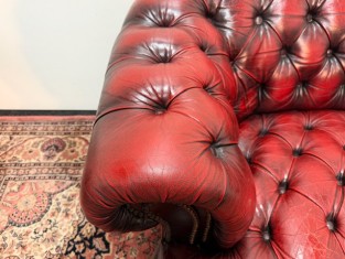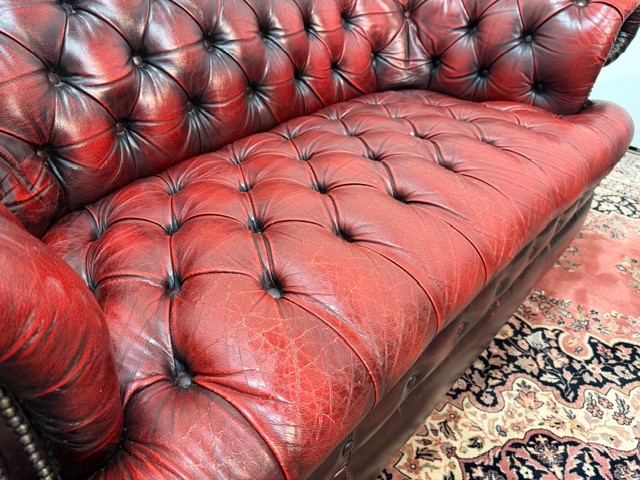 Nábytek je čalouněn kůží s odstínu bordo , místy s typickou sympatickou patinou