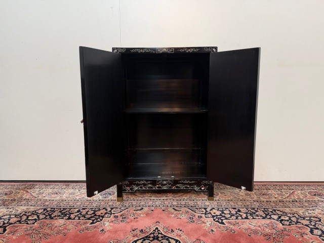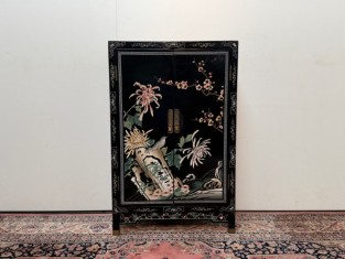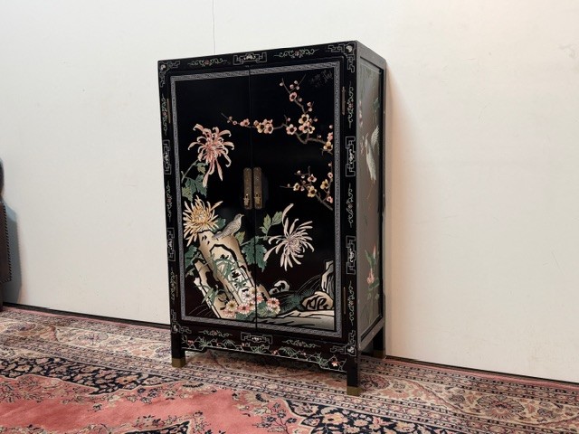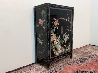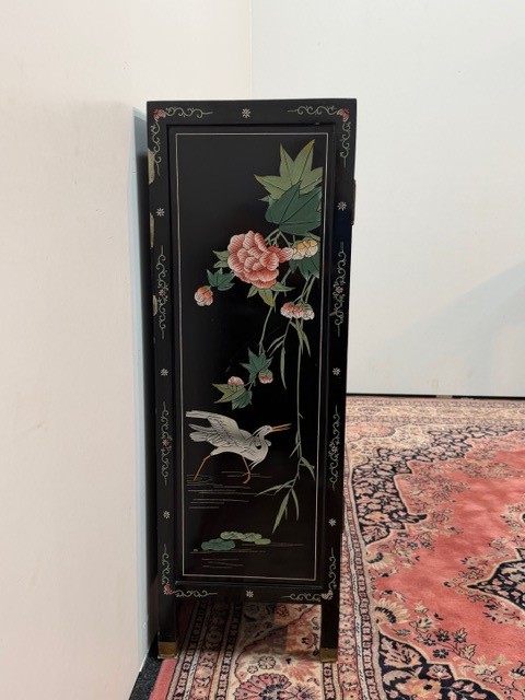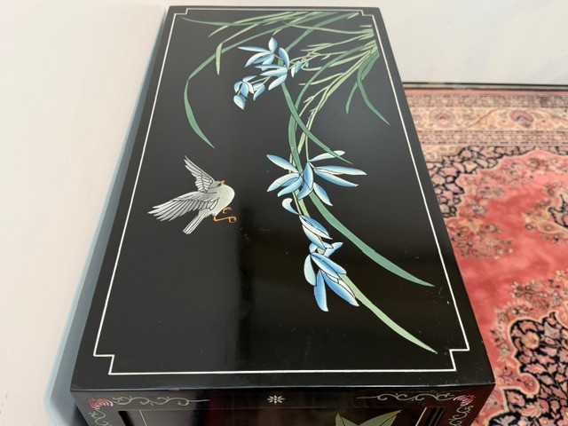 Povrch komody je dekorován ruční malbou s florálním motivem a ptáky