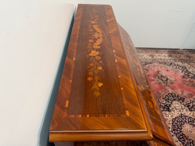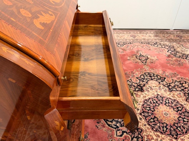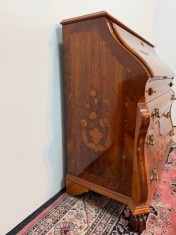 Nábytek upoutá svým elegantním zaobleným tvarem a bohatými intarziemi