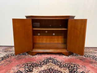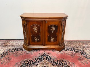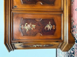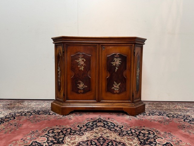Komoda v odstínu ořechu he po všech dekorována ruční malbou s florálním motivem na kazetách s kořenovým dřevem