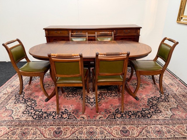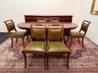 Ke stolu náleží šest kusů židlí čalouněných umělou kůží v zeleném odstínu se zlatým lemem