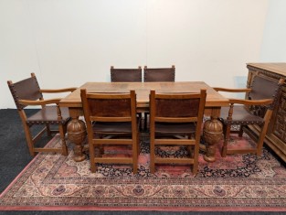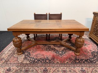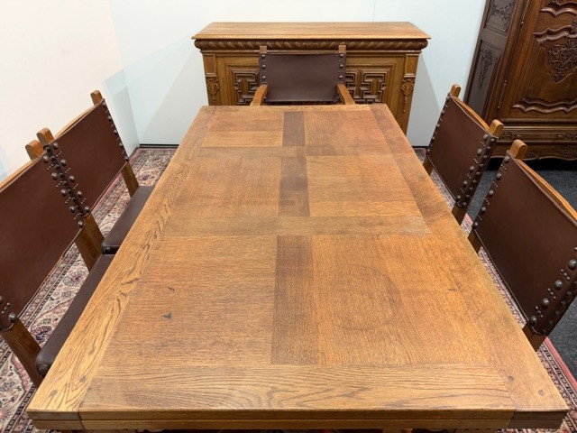 9200: Starožitný jídelní stůl Mechelen rozkládací 4 židle a 2 křesla kožené