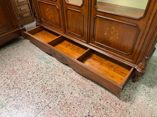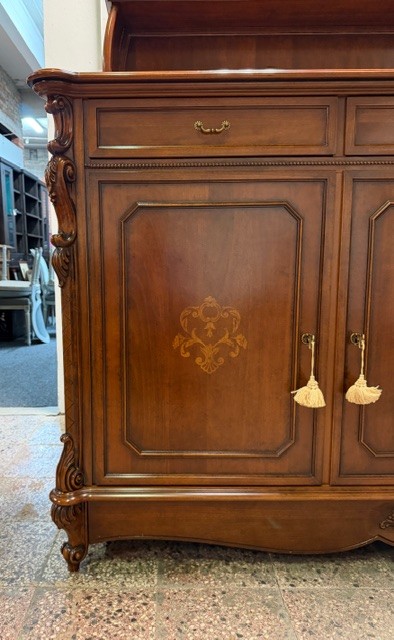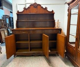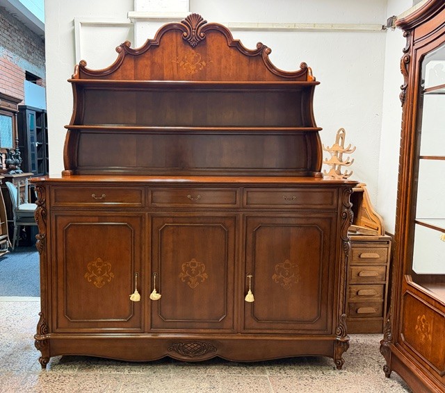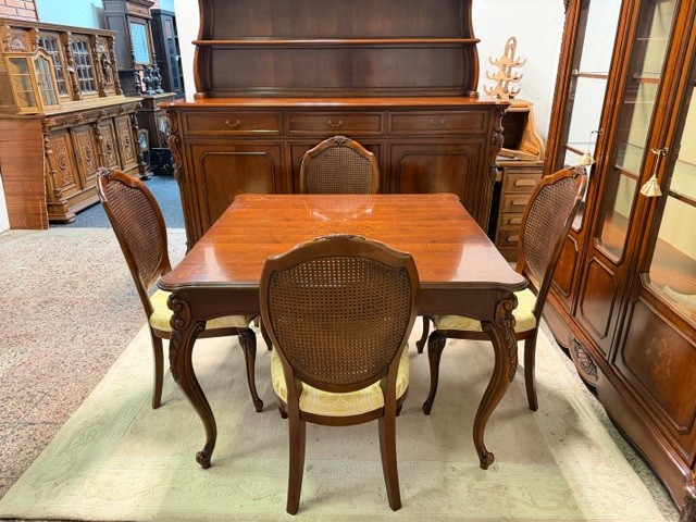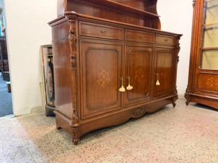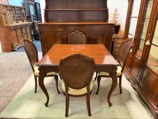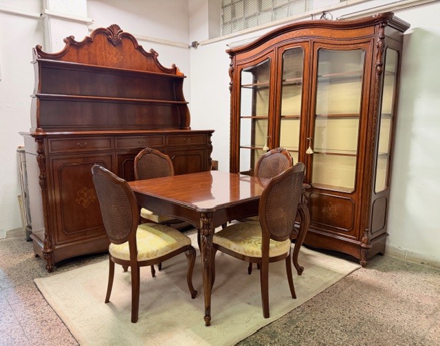 Set je tvořen komodou/příborníkem sesní,atelnou vysokou řezbovanou nástavbou s policemi , vitrínou a jídelním stolem se 4 židlemi