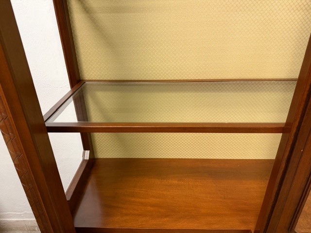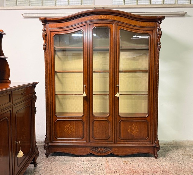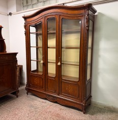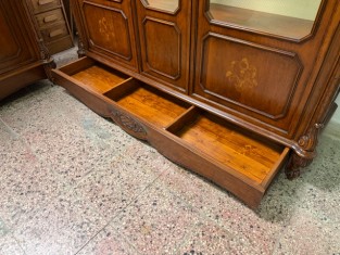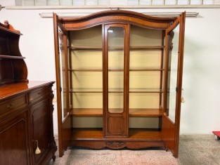 Vitrínu lze demontovat , zadní díl je čalouněn, vitrína je dvoudvéřová, skleněné výplně mají široké fazety