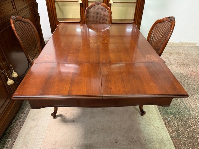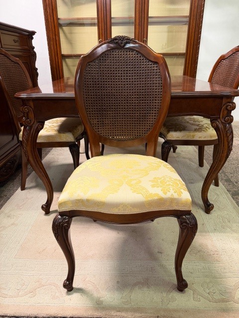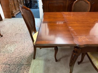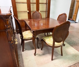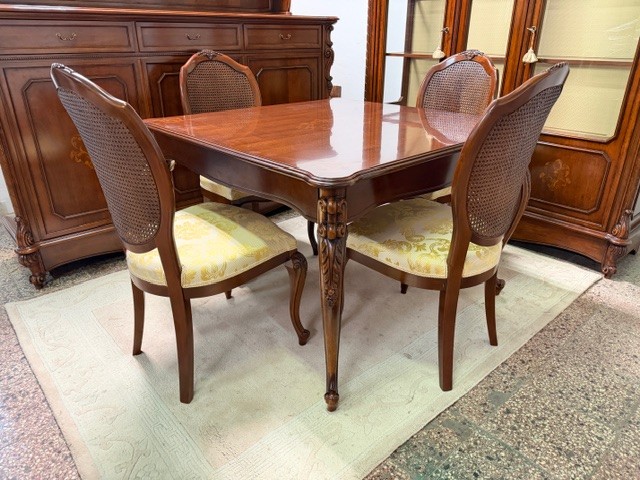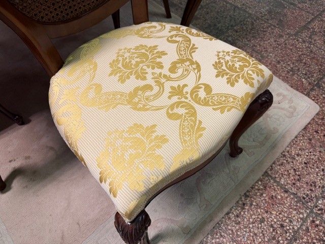 Ke stolu náleží 4 kusy židlí , zádová opěra je dekorována dvojitým pedigem , podsedák je čalouněn velmi kvalitní textilií , která byla užívána s chráničem, je tudíž v perfektním stavu.