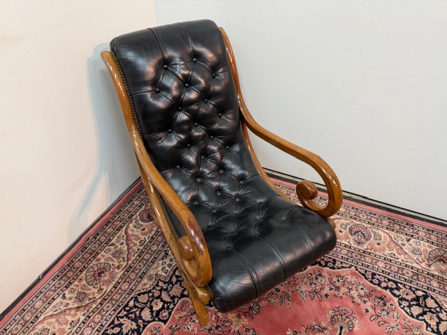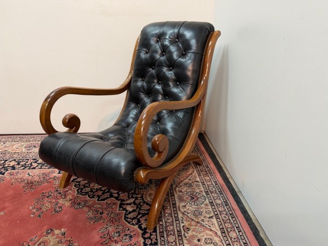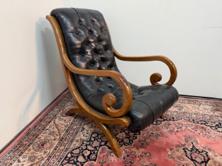 Toto stylové odpočívací křeslo má typicky tvarovanou konstrukci z ořechového dřeva a je čalouněno černou kůží