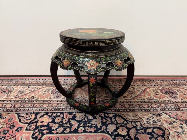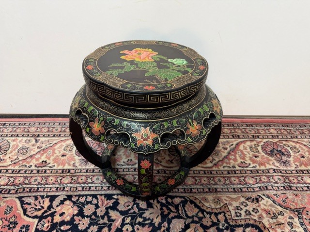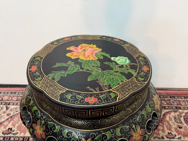 Povrch je tradičně v černém laku s ruční malbou s florálním motivem