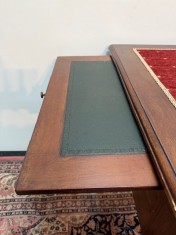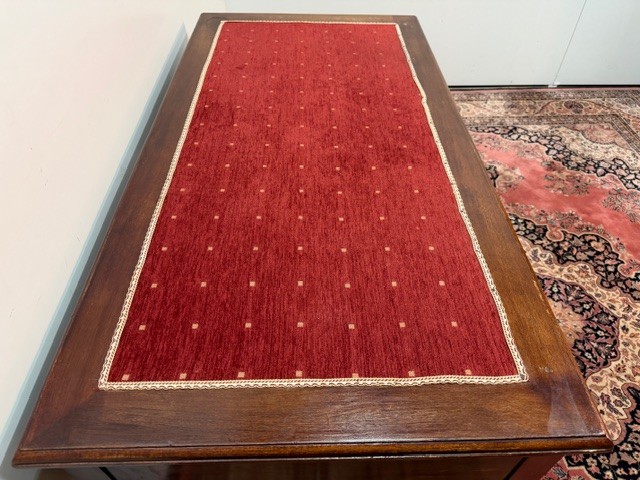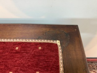 Původní kožené čalounění desky stolu bylo někdy v minulosti odstraněno a nahrazeno textilií v odstínu bordo