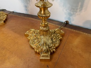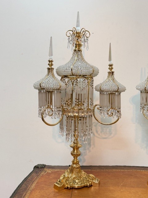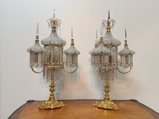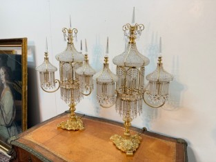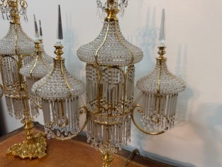 Lampy mají centrální sloupek a několik ramen ve tvaru luceren, visící křišťálová hranolové a mandlové ověsy