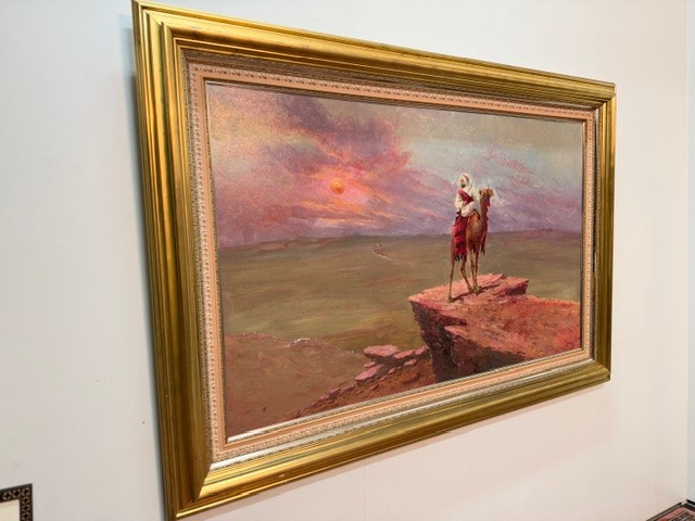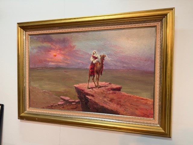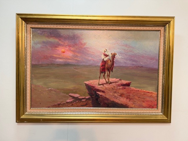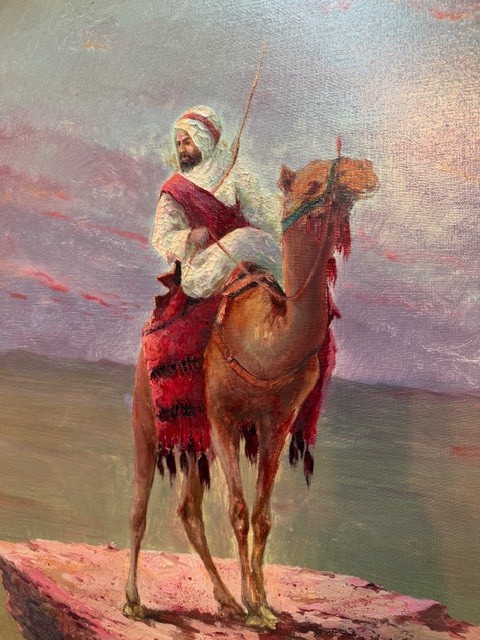 Obraz zachycuje orientální scénu s jezdcem a velbloudem, stojícím na skalnatém útesu při západu slunce