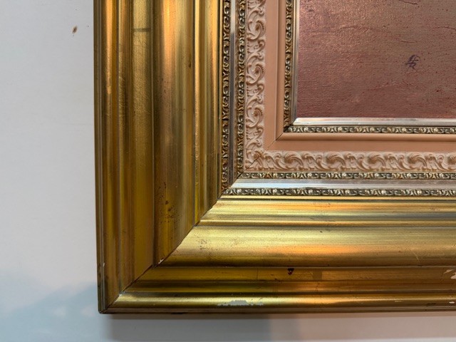 Obrazu dominují teplé tóny , dílo je zasazeno do výrazného zbobeného rámu