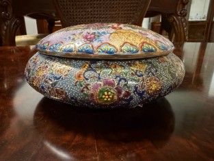Doza je ručně malované smalty a zlacením s motivy květin a ptáků