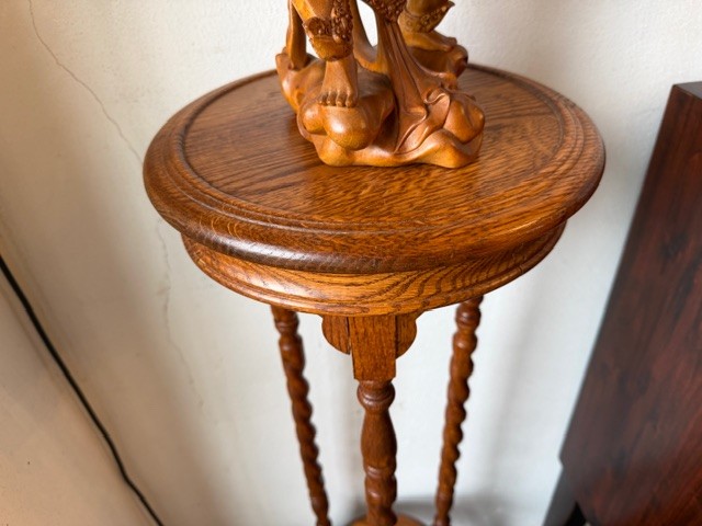 Stolek má tři nožky z tordovaného dřeva